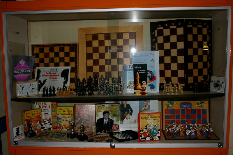 In einem Schaukasten können sich die Kinder über die Vielfalt an Schach(trainings-) Materialien informieren.