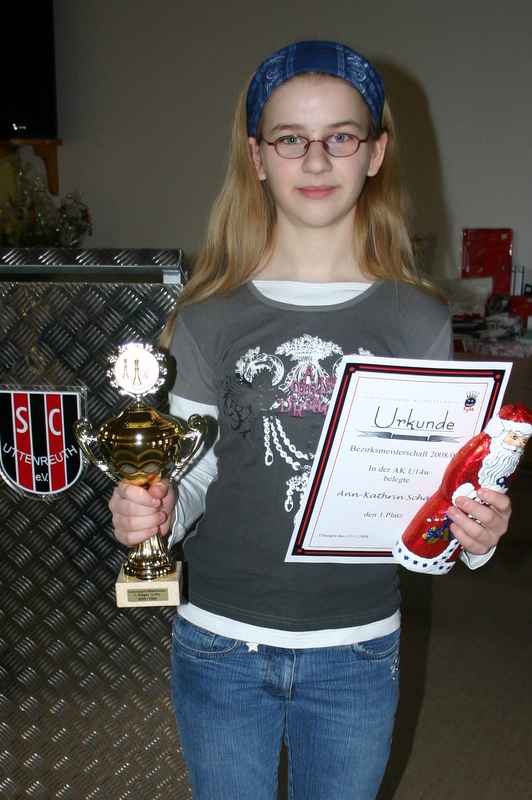 Zur Mittelfränksichen Meisterschaft in Uttenreuth (31 Teilnehmerinnen!) reisten wir mit vier Mädchen, darunter zwei Titelverteidigerinnen. Ann-Kathrin konnte ihren Titel souverän (100 %) verteidigen. Lea musste den Altersklassenwechsel hinnehmen und zudem hatte sie nicht ihren besten Tag. Mit 2 Niederlagen landete sie auf dem geteilten dritten Platz. Christina hielt sich wacker und vergab 2 x gute Stellungen. Carolin kämpfte mit ihren 7 Jahren in der U10 toll mit und wurde 6. Unser Mädchenteam wächst. Super gemacht!