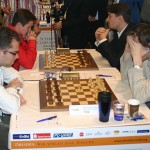 Für die erste Mannschaft vom Gastgeber Deutschland ging es (nach der bisher einzigen Niederlage gegen Israel) auf der Tribüne gegen Polen um den Anschluss an die Spitze. Nach einem schnellen Unentschieden an Brett 2, musste sich gegen 19 Uhr dann unser letztjähriger Simultanspieler GM Jan Gustafsson geschlagen geben. Trotz der verständlichen Niedergeschlagenheit konnte ich Jan zu einem Foto mit Dieter und Shorty überreden (leider ist es ohne Blitz etwas verwackelt). Etwas zu spät kam dann Christina und Papa musste noch einmal ran um ihr ein Autogramm von Jan zu ergattern. Schachfreund GM Michael Prusikhin musste sich in der Mannschaft Deutschland III zwischenzeitlich leider auch geschlagen geben.
