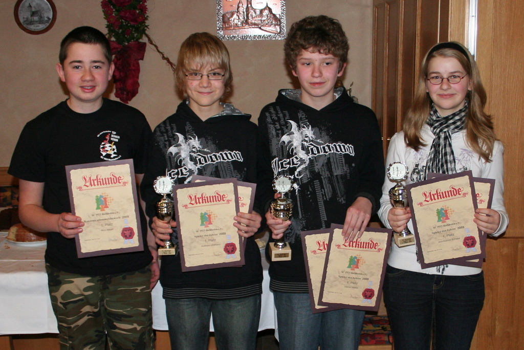 Mit nur einem (ausgekämpften) Remis gegen die Vizemeisterin Ann-Kathrin konnte sich Daniel an die Spitze des 16 Spieler umfassenden Feldes setzen und sich zum alleinigen Jugendmeister küren lassen. Die Vizemeisterin Ann-Kathrin musste ein weiteres Remis gegen Andreas zulassen, der sich somit den dritten Platz sicherte. Mit auf dem Bild ist der Sieger des Konzentrationswettbewerbs Nico.