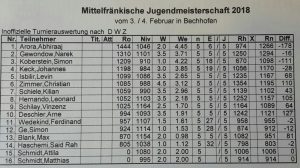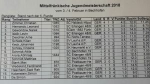 Nach einer spannenden Schlussrunde, in der die beiden letzten Partien über den 2. Qualifikationsplatz entschieden haben, standen die Meister fest. Nachdem Leonard Hernando bei einem Qualitätsvorteil zwischenzeitlich ein Remisangebot abgelehnt hatte, übersah er später ein dreizügiges Matt und der neue Mittelfränkische Meister heißt Christian Zimmer, der überragende 4 1/2 Punkte verbuchen konnte!
