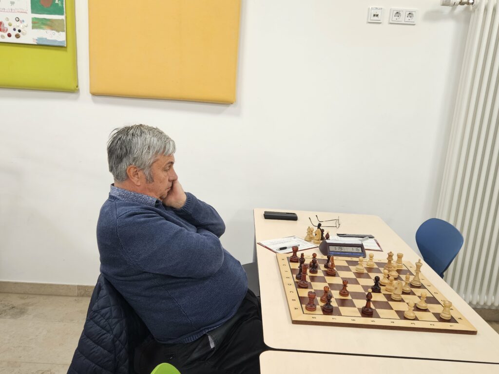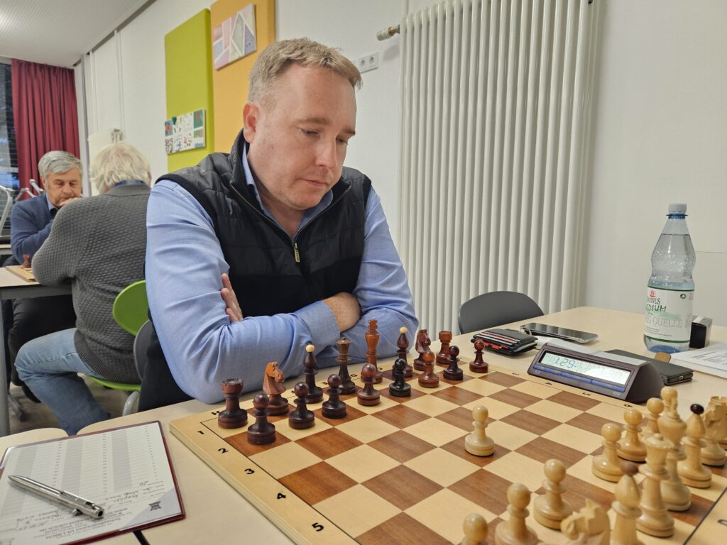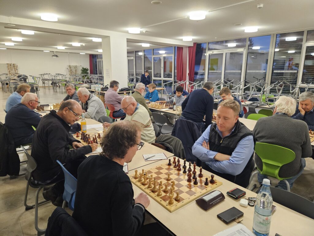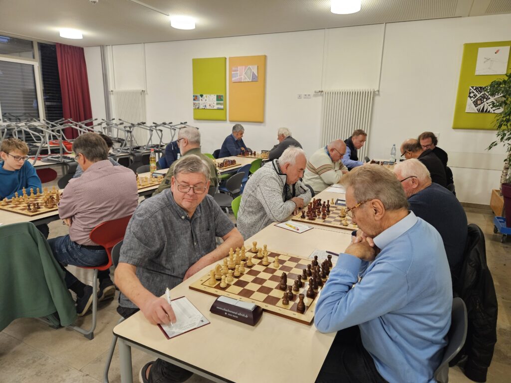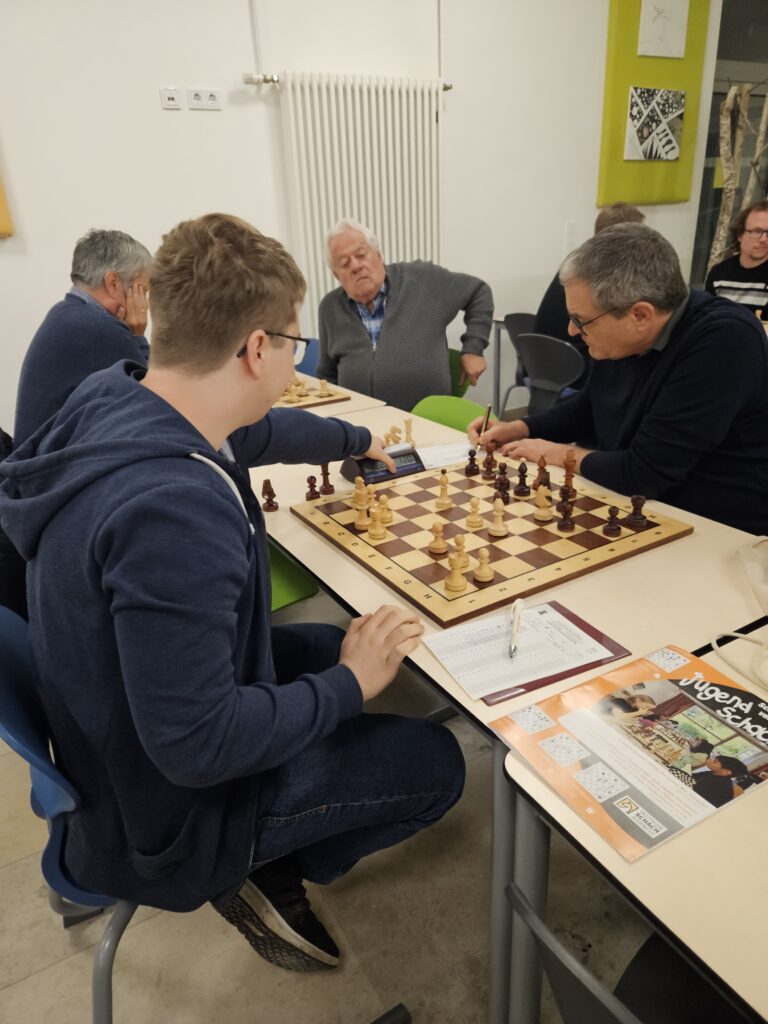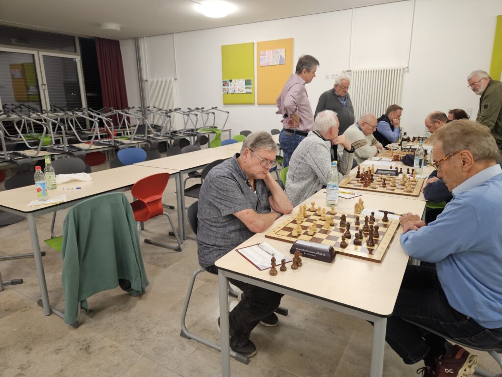 spannend geht es in die vierte Stunde. Um 21.30 Uhr beendete Hans mit einem Sieg und sicherte den Kampf vorzeitig. Hans-Dieter übersah in gewonnener Stellung einen Verteidigungszug und musste an Stelle eines Schönheitspreises eine Niederlage hinnehmen. Unser früherer Spieler der ersten Mannschaft Josef Weeger fand nach über 30 Jahren wieder zurück zum königlichen Spiel. Er lehnte gegen Karlheinz beim Stand von 1:5 ein Remisangebot ab und überschritt bei seinen Gewinnversuchen die Zeit. Die letzte Partie am Spitzenbrett konnte Thomas gegen Jan gewinnen.