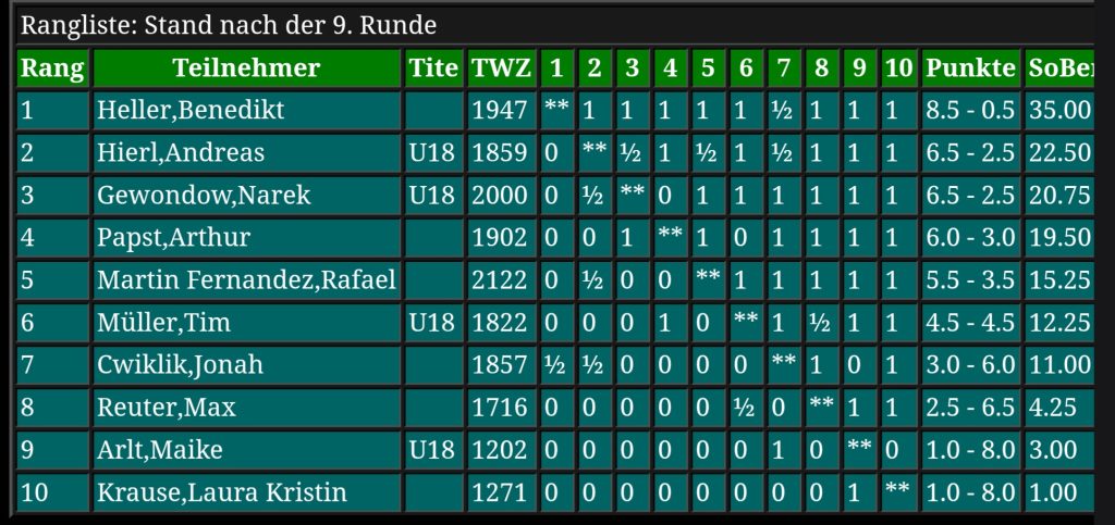 Die Mfr. JEM der AK U16/18 konnte Benedikt mit 8,5 / 9 überlegen gewinnen.