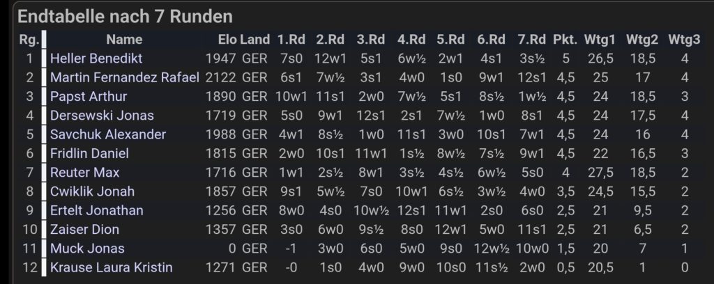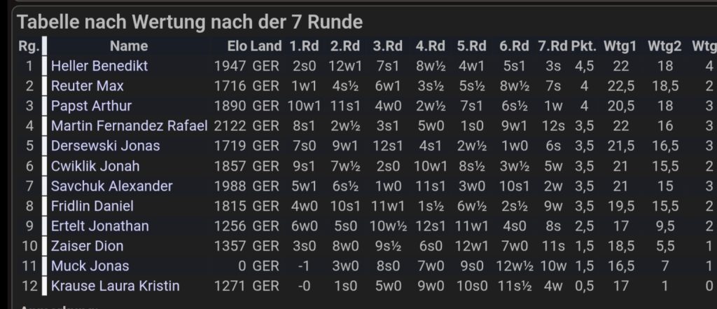 Als einziger Spieler mit 5/7 Punkten konnte Benedikt einen weiteren Höhepunkt in seiner jungen Schachlafbahn setzen.