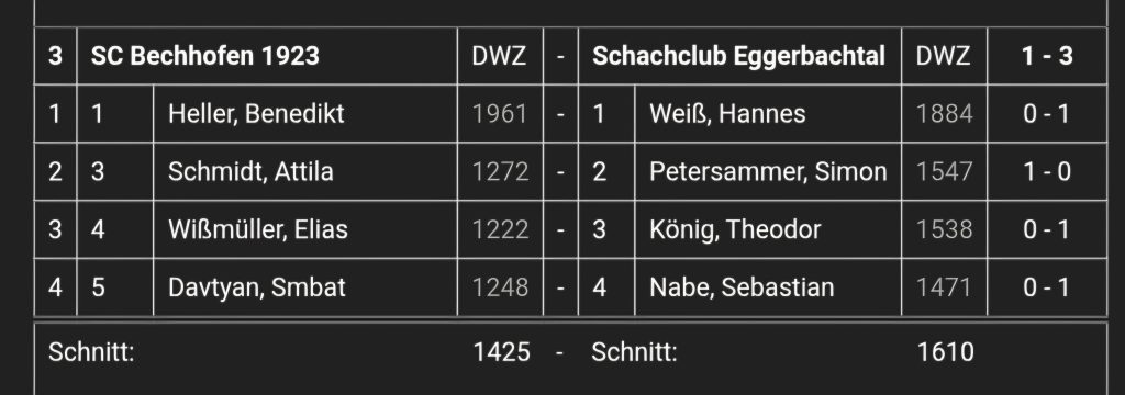 Leider lief der Kampf nicht wie erhofft. Smbat ließ ein 2-zügiges Dauerschach aus und Elias kam in hochgradig Zeitnot. Nachdem Attila auf 1:2 verkürzen konnte lag es bei Benedikt. Wie erwartet unternahm dessen Gegner nicht allzuviel und die Partie ging in beiderseitiges Inkrement. Leider brauchte Benedikt nun den vollen Punkt und konnte seine Partie nicht zum entscheidenden Vorteil bringen (Stockfish wird die Aussage noch wiederlegen) und überschritt am Ende noch die Zeit.