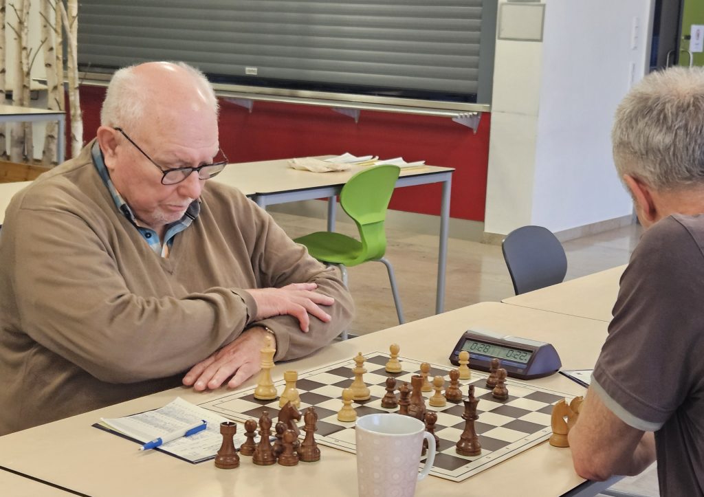 Klaus konnte nach seinem Einsteller in der Eröffnung mit 9 sec. auf der Uhr die Partie ins Remis bringen und den Sieg sichern. Shaiar spielte nun noch auf Sieg und überzog. Karlheinz stellte in sehr taktischer Stellung eine Figur ein und gab auf. Hans-Dieter übersah ebenfalls einen Einsteller und konnte die Partie in der längsten Partie noch remisieren.